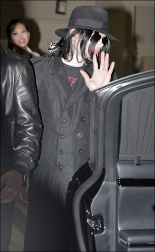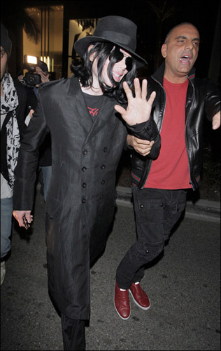 曾经的天王,曾经的巨星,曾经的富豪乐坛最重量级天王迈克尔·杰克逊在宣布拍卖自己的收藏品后首次露面,在设计师Christian Audigier的陪同下外出购物。天王不管走到哪里都有无数的狗仔队跟踪,当天的迈克尔·杰克逊身穿黑色礼帽,黑色风衣,黑色裤子黑色鞋子,带黑色蛤蟆镜,一身黑色更显得容颜憔悴,皮肤苍白,我们真的很怀念的那个曾经的天王。