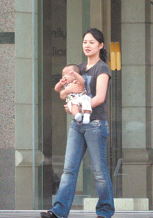 六月初的一天下午,四点钟左右,姜文的切诺基驶出了车库,记者看到坐在车上的是三位女士,汽车朝三里屯的方向驶去,汽车最后来到了三里屯附近的一所外资私立医院停了下来,从驾驶座上下来的正是一年多没在媒体面前露面的周韵。从与姜文的恋情被曝光,到拍摄《太阳照样升起》,再到怀孕生子,周韵很长时间没有接受记者的采访,或在公开场合露面,记者上一次看见她还是两年前她和姜文在太庙漫步。与那时相比,周韵明显胖了不少,没有化妆,素面朝天,头发也简单地扎了一个辫子,穿着也是普通的牛仔裤和T恤,少了几分明星的光彩,却多了几分“漂亮妈妈”的成熟和恬淡。跟周韵一起下车的是一位年轻的女士和一位中年妇女,周韵小心而充满疼爱地接过中年妇女递过来的孩子,而这个孩子正是她和姜文爱情的“结晶”。