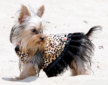 中新网7月19日电 据英国每日邮报报道,爱出风头的帕丽斯·希尔顿不仅要把自己打扮得漂漂亮亮,就连她的宠物狗也不放过。昨天,帕丽斯外出时穿上一套性感的豹纹装,并给她的宠物狗也穿上了一件同款豹纹装,上面还带有一条黑色的蕾丝裙边,十分抢眼。