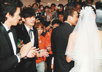 据台湾联合报报道,周杰伦因台风滞留香港一天,为了等他,好友刘畊宏原订6时30分开始的婚宴,延到快8时才开始。为了让所有媒体能访到周董,婚宴现场更破天荒在喜宴开始前举行记者会,新郎、新娘带领着伴郎、伴娘坐成一排,接受媒体访问。
