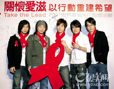 摇滚乐团五月天前天来到台北101为2007世界艾滋病日点灯活动献唱,并与台湾知名棒球选手王建民一起点亮台北101外墙上的红丝带,与世界同步关怀艾滋病患者,传递爱心。 (晨晓)