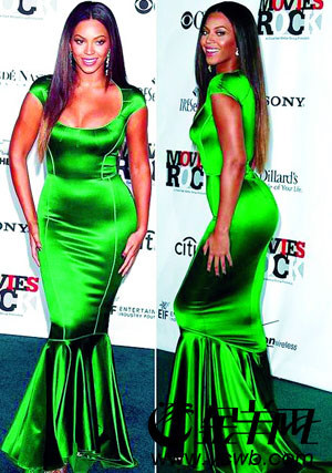 英国“真命天女”乐队的主唱碧昂斯日前在好莱坞柯达剧院参加一个明星派对,本来就身材性感火辣的她特意身着一件绿色的鱼尾服出场,低胸的设计更是突出了她丰满的胸部,乳沟尽现,两个挺拔的半球呼之欲出。