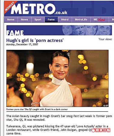 中新网12月18日电 上星期英国《镜报》报道《诺丁山》(Notting Hill)男星休·格兰特(Hugh Grant),与一名亚裔女子在伦敦一间日本餐厅当众缠绵,其间他的一名男友人也对该女子上下其手。昨日《镜报》指该名女子为舒淇,惟舒淇经理人得悉报道后作出严正否认,不排除采取法律行动。