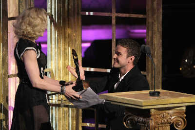 贾斯汀“下跪”为流行乐“女王”麦当娜颁奖