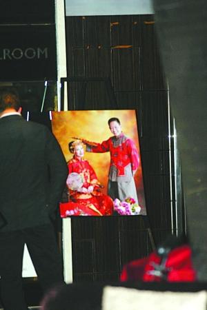 在婚礼现场门口摆放着王志文和陈坚红的中式结婚照。
