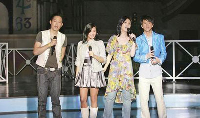 泰国歌手TWO(左起)、菲律宾歌手Nikki Gil、杨千嬅与光良合唱不同语言的《世界真细小》。香港明报图。