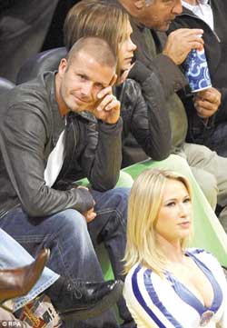 看湖人比赛“偷看”拉拉队员 小贝气坏辣妹(图)