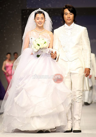 中新网5月27日电 据朝鲜日报报道,26日下午,安德烈-金“2008联合国儿童基金会后援之夜”特别服装秀在忠清北道青南台垃圾艺术公园举行。当天,韩流明星宋承宪、金泰熙作为模特登台走秀,在舞台上演绎了幻想的爱情故事。