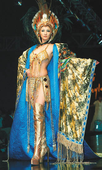 中新网7月14日电 据台湾媒体报道,台湾名模陈思璇昨天金光闪闪走秀,后台同事见到她都摇头叹息:“钱真难赚!”因为她的头饰很重,又要粘假胡子,里面还穿金色比基尼,举手投足、氛围掌握都是巨大挑战。陈思璇笑说:“我尽量想成在拍电影‘满城尽带黄金甲’啦。”