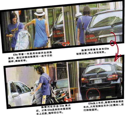 该报道指出,两人是在周杰伦的牵线下认识,第一次见面就十分投机,当天互换电话和MSN,之后进而交往。当时陈楚河还告诉朋友“认识了一位开朗的女生,和她聊天真的很快乐”。之后因为受不了Ella常因小事闹情绪,希望她平时独立,和他在一起时要像小女人;加上陈楚河曾向电视台高层推荐由Ella来担纲《命》剧女主角,结果不仅传出绯闻,还遭到“未红先骄,拍戏还指定女主角”的批评。于是快刀斩乱麻决定分手。5月初Ella接受媒体专访时谈到一段刻骨铭心的秘恋,并公开喊话,“如果他开口,我会和他复合,就算当时我有男友了,也愿意为了他和男友分手。”媒体当时都将秘恋男主角指向吴尊,熟知的友人却透露,诉说的对象其实是陈楚河。不过,就是Ella这段话打动了陈楚河的心,让他们重拾恋情。