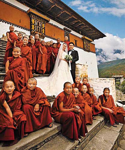 报道介绍,梁朝伟和刘嘉玲选择在不丹这个佛国家办婚礼,原因不丹是一个庄严和神圣的地方。快乐指数高达97%的不丹人婚姻实行一夫多妻或一妻多夫制,更有些不丹民俗需要男方入赘女家。当地传统婚礼非常简单,一对新人分别穿上不丹传统服装“Gho”和“Kira”,在双方亲友见证下进行,他们在婚宴上都以简单的辛辣菜式招呼亲友。