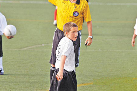 9岁的布鲁克林踢球颇有贝克汉姆之风。