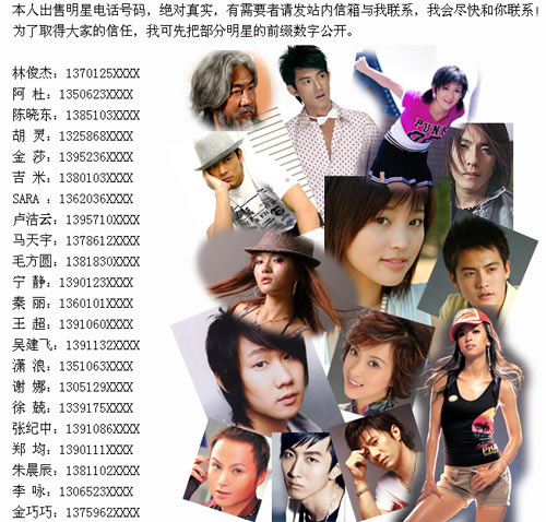 近日,原某国际唱片公司员工,年仅19岁的知名宣传cirry(陈琪)电话遭盗,手机里88名明星电话也被盗窃者公布于网络,被曝名单中包括林俊杰、陈晓东、金莎、胡灵、阿杜、谢娜、阿清、朱晨辰、马天宇、吉米、好男吴建飞、快男刘洲成、好男毛方圆、超女卢洁云、秦丽、型秀王超、潇浪、制片人张纪中、主持人李咏、袁泉、韩国艺人SARA等88名香港内地明星电话号码被曝光,不少明星已被多次骚扰,不得已换号码。
