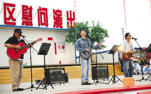 得知“心连心”前来演出,不大的擂鼓镇广场挤满了 5000多名从四处赶来的北川人。上午9时,在导演兼主持人马东的“吆喝”中,央视名嘴王小丫、张泽群、董浩、撒贝宁、韩乔生乐一一亮相,分别为灾区人民送上一句祝福。而最难得的场面是平时说比唱多的央视名嘴齐秀唱功。不过最搞笑的当属“韩大嘴”,他一发声,调不知跑哪儿去了,顿时笑翻全场。接下来,鞠萍、赵保乐的《为了谁》,郭峰演唱的《胜利》,孙悦等人演唱的《好人好梦》和观众进行了台上台下的热烈互动,把现场气氛推向高潮。