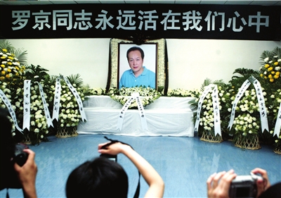 得知噩耗后,胥午梅和同事将央视新闻中心播音组的办公室布置成一个简易灵堂,他们冲洗了一张罗京的黑白照片放在醒目处,周围摆上菊花,用白布将墙裙和衣柜桌椅包裹。