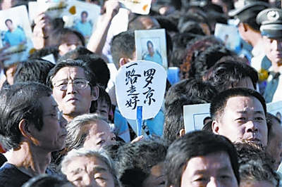 清晨开始,来自各方的群众自发前往八宝山悼念罗京,长达百米的队伍蜿蜒而至公墓大门之外,数百只花圈摆满灵堂两侧,寄托着各方人士对罗京的缅怀之情。有白发苍苍步履蹒跚的80岁老人,有在父母带领下、牙牙学语的孩子,有从小与罗京一起学习的同学,有罗京高中母校的代表,有曾经受过他指导的实习生,还有专程从美国赶来送罗京最后一程的校友,很多人忆起与罗京生前的点滴黯然泪下。近万人的哀悼队伍井然有序,大家手持白菊,每七人一组向罗京遗体三鞠躬,为“国嘴”祈祷送行。