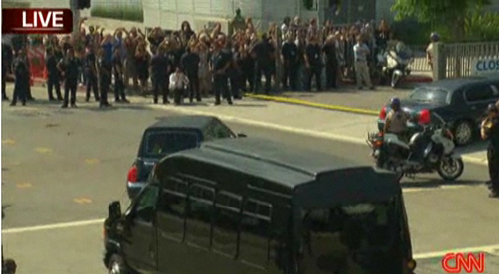 中新网7月8日电 CNN消息,迈克尔.杰克逊公众追思会即将开始,参与演出的嘉宾们也陆续到达斯台普斯中心,嘉宾们从中心后门人进入。