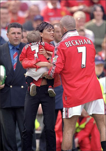2000年,维多利亚带着可爱的儿子去看贝克汉姆踢球。温馨的画面。