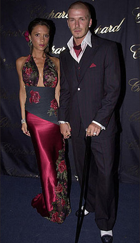 2001年7月两个人手牵手出席艾滋病基金会的公益活动,注意了贝嫂开始没有笑容了。