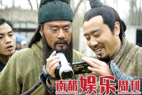 “关羽”于荣光和“刘备”于和伟在观看DV中的花絮。