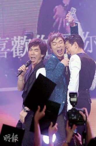 中新网8月10日电 刘德华 、任贤齐与许志安前晚在香港举行《钻石巨星音乐会》,三位巨星展示男人魅力,观众反应热烈。音乐会由任贤齐打头阵,然后由许志安献唱不少男歌星的金曲,刘德华则压轴出场。三人合唱多首金曲时,刘德华情绪高涨导致摔倒、又拿水淋许志安及自淋湿身;其间,刘德华更险些把安仔推倒在台上,幸有惊无险。