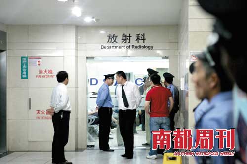 晚上8点之后,记者们都聚集到一楼放射科门前,这里过路者很多,很快又聚集了一批围观者,医院方面临时从其他楼调来了多名保安。尽职的保安们一丝不苟地把一楼大厅清空,将记者和大批围观者赶到楼梯上,大家只有伸着脖子才能望见放射科的玻璃门。