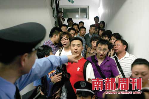 一个半小时后,放射科还是不见动静,之前“血管造影”的说法开始遭到怀疑,记者和保安的关系也慢慢紧张起来:保安们坚持要求记者继续后退,但记者们不同意。也有摄影记者和保安打趣,“你去把他推出来,阿拉排好队一人拍一张,大家都下班好了。”