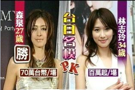 被与台湾第一名模林志玲相提并论,森泉害羞地说不如林志玲;事实上,森泉比林志玲小7岁,两人身高都有174公分,森泉出席活动价码一场70万台币起跳,相较于林志玲百万起跳略逊一筹。有意进军台湾的她坦言还要多学习,朝全方位迈进,有朝一日能跟林志玲一样。