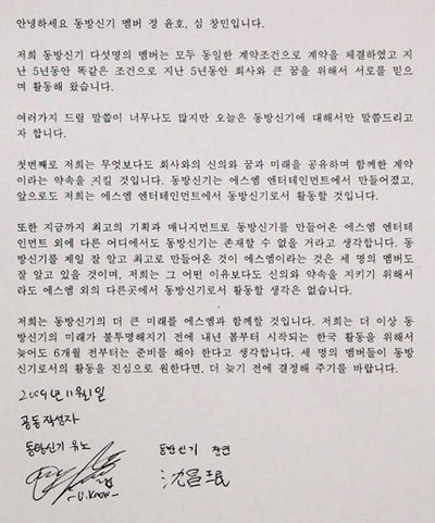 “朝鲜日报”消息,SM娱乐于11月2日在首尔汝矣岛63大厦就法院部分接受三名成员主张一事召开了记者会。U-Know允浩和最强昌珉在此公开了由两人亲笔签名的文件。 允浩和昌珉在这份文件中主张:“3名成员提出所谓的临时处理申请后,我们不停地被人追问到底为什么发生了这种事。用一句话说,似乎就是在3人开始从事化妆品生意后,一切都发生了变化。”