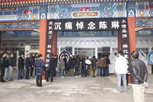 中新网11月6日电 歌手陈琳的追悼会今天下午低调在八宝山举行,灵堂布置肃穆,众多亲人好友送上花篮送她最后一程,而她的现任丈夫张超峰也现身哀悼。