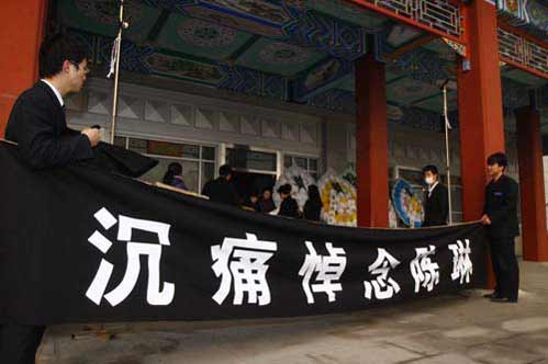 据“凤凰网”消息,追悼会现场挽联挂出,上联“爱就爱了,鹤鸣尤作步虚声”;下联“不懂柔情,蝶化竟成辞世梦” ;横批为“沉痛悼念陈琳”,字里行间运用陈琳生前音乐作品名称表达着无尽的哀念。同时现场记者发现部分亲友已告别完毕陆续走出告别室,告别室正中央摆着陈琳母亲送上的百合花,上书“爱女陈琳”。