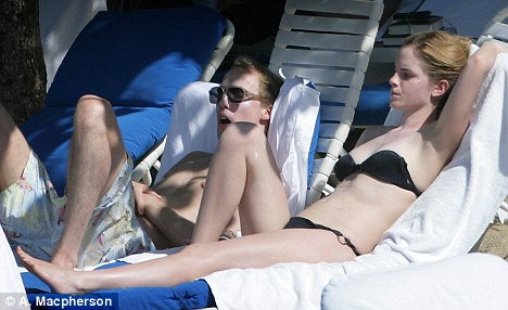 美国感恩节期间,《哈利波特》中"赫敏"艾玛·沃特森(Emma Watson)与男友、26岁的金融家杰巴里摩尔(Jay Barrymore)一起来到加勒比度假,身穿黑色比基尼与男友一起享受日光浴的艾玛脸上一丝笑容也没有,之和男友逢场作戏式的戏水,和当时美丽的场景真是大相径庭。