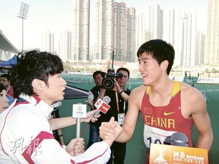中新网12月12日电 “栏王”刘翔昨午在东亚运动会110米栏决赛,以13.66秒夺金,获得全场近5000名观众喝采,当中包括好友古巨基 。古巨基与刘翔交情深厚,去年北京奥运,刘翔脚伤退出比赛,令古巨基无缘在终点见证刘翔冲线一刻;昨午他终于如愿,心情刺激又兴奋,两人以“阿翔”及“基哥”相称。