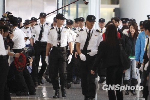 “重兵”护卫郭晶晶抵达香港。中新社发 盛佳鹏 摄