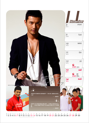 在最后一辑曝光的台历里,“冬之星”:黄晓明、张涵予、萨日娜、尚雯婕与众多华谊旗下美丽帅气的:姜鸿,党淏瀚,丁咛、冯绍峰,何琢言、胡可、刘孜、刘科、刘芸、郭家铭、巩新亮、张俊宁、董璇一起,为华谊兄弟2010年台历来了个堪称完美的收官。