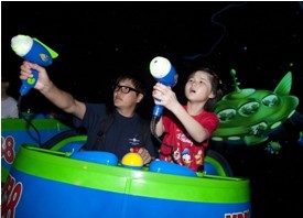 紧接着父女俩一齐来到巴斯光年星空历险,拿着太空枪帮助巴斯光年对战索克天王,只见小宝瑶冷静的瞄准扫射,一点也不比爸爸逊色,虽然之前面对镜头的时候还有些害羞,但一瞄一射颇有大将风度。在3D剧场影院,和爸爸一起戴上立体眼镜欣赏米奇幻想曲,跟米奇丶唐老鸭及他们的好友一起经历满载惊喜和欢笑的旅程;玩了大半天,之前还有些害羞的小宝瑶开始兴奋起来,来到明日世界的驰车天地,牵着爸爸跑向车道, 一边还兴高采烈地向车道外的工作人员打招呼。