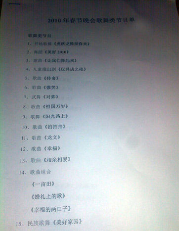 一份央视虎年春晚歌舞类节目单昨日在网上被曝光,节目单为打印版共两页纸,节目共计25个,包括《传奇》(王菲演唱)、《相亲相爱》(容祖儿/孙楠演唱)等歌曲。宋祖英的《让我们舞起来》被安排在第三个节目,而小虎队的联唱则在零点以后才能听到……