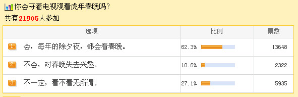 央视春节晚会作为每年农历新年的开年大餐已经走过了26个年头,从当初的惊鸿一瞥变成如今的美人迟暮,虽“形式老套,一年不如一年”,但它仍被13亿人关注着。据“虎年春晚你会看吗?”的调查显示,在参与投票的21905名网友中,有62.3%的网友选择会看春晚;表示无所谓的,占了27.1%;另有10.6%的网友表示“已对春晚失去兴趣”。