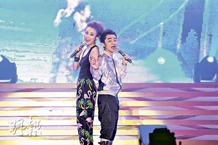 高度相差大截的容祖儿及王祖蓝,搞笑地反串性别大唱情歌。