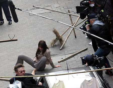 林志玲于5日现身上海街道拍摄打斗戏,正式开拍时,因林志玲的“母亲”被凶徒绑架,林志玲披头散发、赤足追赶,与对方搏斗时,她连续演绎了扇巴掌、掐脖子、挥木棍打人的动作戏,最后被重重一推,她四脚朝天地摔在地上。