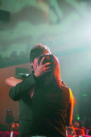 之前的一次颁奖礼上,那英和孙楠曾被要求再现当年激吻的一幕,但终因孙楠不配合而作罢。前晚,那主席在活动接近尾声时荣获“十年最具影响力音乐人物”大奖,她在现场言辞激动甚至动情落泪,终于和孙楠再次互相亲吻,而且是亲完脸颊又亲嘴。那主席希望自己的儿子和女儿将来也喜欢音乐,然后她嘱咐众多音乐新势力人物要多多帮助儿女的音乐之路。她说自己还蛮嫉妒这些获奖的新势力们有那么高的人气。