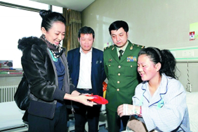 昨天下午2时,章子怡出现在武警总医院藏族女孩卓玛尕措的病房里。上午9时刚刚接受了第二次手术的卓玛看着如大姐姐般亲切的章子怡,美丽的大眼睛溢满了晶莹的泪水。