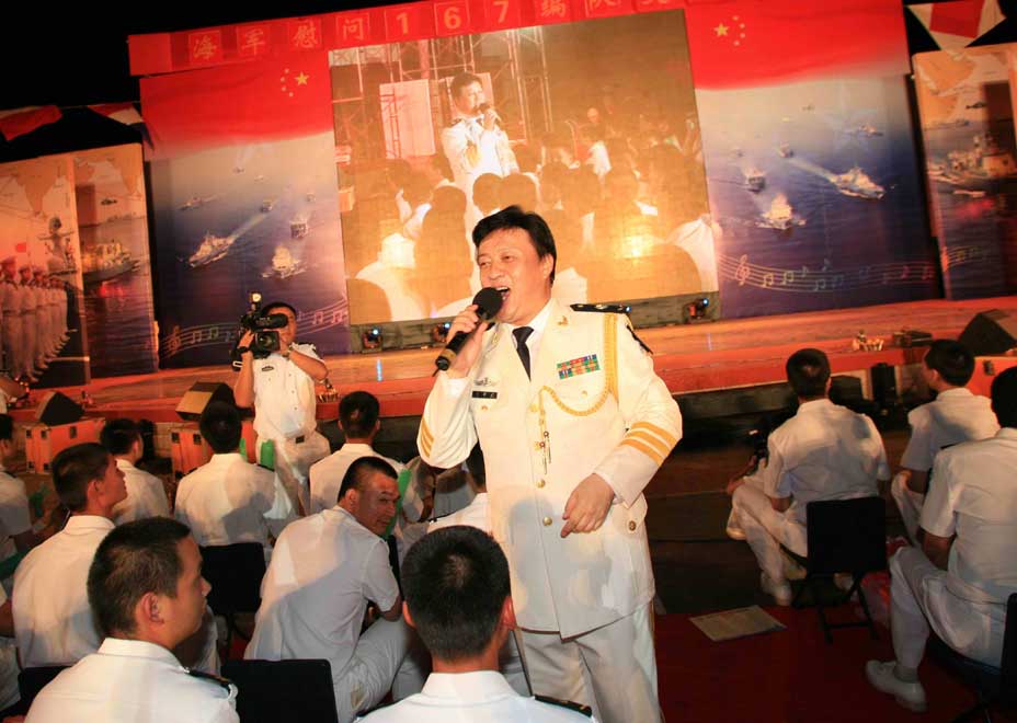 中新网8月22日电 8月21日晚,宋祖英、吕继宏等多位名星,齐聚南海舰队某军港,为刚刚凯旋的海军第二批护航编队官兵献上了一台精彩的演出。