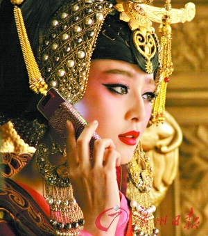 电影中的这场戏,是范冰冰扮演的大明星王菁菁在拍片现场与男友通电话,还穿着戏服直冲到舞会现场,古代与现代的反差制造出“穿越”的效果,极具喜剧感。剧组特别邀请到北京奥运会开幕式的核心造型师陈敏正打造这个古装造型。