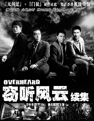信息时报讯 (记者 陈爽) 刘青云等三大型男主演的《窃听风云》上映10天内地票房劲破6000万元,且香港首周票房也超过530万港元,片方宣布将在本周五举行庆功宴。同时,由于影片叫好叫座,投资方开拍续集的意愿相当强烈,甚至一早就公布了续集的概念海报(上图),海报主打刘青云、古天乐、刘德华、甄子丹四大型男,之前广州宣传时被“忽略”的吴彦祖就踪影全无。