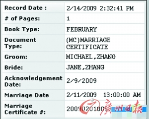 有媒体爆料,在美国新泽西州网站发布的结婚登记信息显示,张靓颖已与英文名“MICHAEL ZHANG”的男子注册结婚。这位神秘男友迈克的真实身份,流传了两个版本。一是张靓颖合作多年的经纪人冯科,但冯科的真实英文名“MICHAEL FENG”,与登记的信息有一些出入。二是这位“MICHAEL ZHANG”是位富二代,中文名张海涛自小随做服装贸易生意的父母移居美国,家族身家数十亿,也是精通20多种乐器的“音乐狂才”。有人爆是在某国际音乐节上,经谭盾介绍,张靓颖认识了这位富二代,而该男友更暗地帮助张靓颖主攻虎年央视春晚。两人更在今年情人节在美国新泽西州登记结婚。