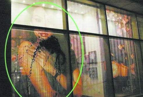 张曼玉没来,章子怡也只是外出吃饭。正当记者们准备收工时,又一件意外的事情发生了。23点,一辆黑色奥迪Q 7在酒店门口停了下来,随后四五个身穿迷彩服、戴着墨镜的男子从车里走下来进入酒店大堂询问保安:“章子怡住几层?”看到保安未予理会,这几个人立刻站在酒店大堂内,用东北话高喊:“大傻X!骗人钱!勾引人老公!”而大约半小时后,这辆车又回到了酒店门前。这次车上下来两个身穿套头衫的男子,手里拿着墨汁,走到酒店东侧一间章子怡代言的铂金店门前,冲橱窗里的章子怡海报将墨汁泼了上去(见上图)。随后,两人上车,Q 7拉着警报扬长而去。