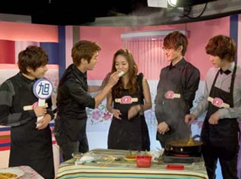 中新网12月31日电 近日,Super Junior-M再度上台湾娱乐节目,抢着做美食给甜心美女主持侯佩岑。节目中,由厉旭和韩庚分成两组进行PK,但被分在韩庚组的东海却包了个巨大水饺,还在里头狂加辣,吓得侯佩岑直说,“妈妈们千万别让他进厨房啊。”