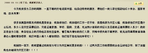 在2008年地震发生后,北京的同事接到子怡捐100万的指示后,他们分别给红十字会捐了两笔钱。我们当时都不在国内,我也没盯这事。但在最近两个星期看到媒体报道说捐款总数没有达到100万,我便开始调查此事。当我寻找捐款收据时,才发现一直没有。今天红十字会告诉我,捐款的收据一直在红十字会那边,因为他们没有寄出收据的地址。当我了解到收据细节时,才确认了善款只有84万元。同时再了解到当时会计和另一个同事她们在各自汇出金额上出现了纰漏,都以为对方汇出了差额。