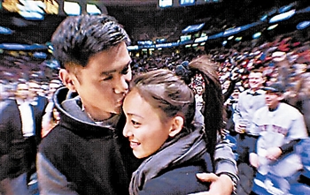 黑人说,易建联建议他要在中场时间求婚,当时场内的老外球迷也充当“助攻员”,不断鼓掌起哄,让范范最后点头同意嫁他。他很爱篮球,求婚当天又是篮球巨星乔丹的生日,如今又求婚成功,意义重大,加上范范应邀在NBA球赛开幕时演唱美国国歌,此行“成果丰硕”。